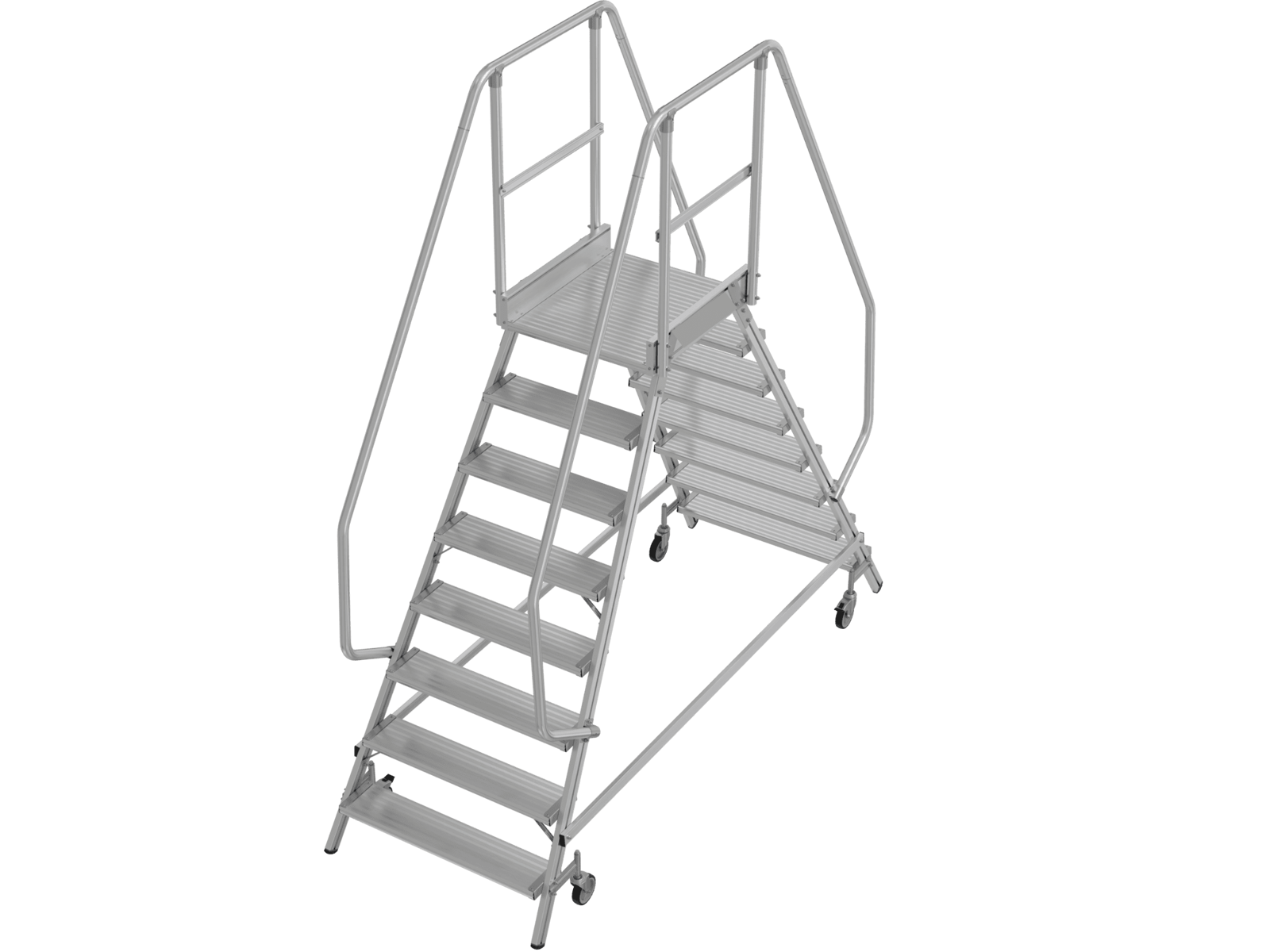 Mobil overgangsplattform med tosidig tilgang og stor 60 x 80 cm plattform. Plattformen kan enkelt skyves rundt med 4 x Ø125 mm hjul, som er låst hver for seg. Plattformen er utstyrt med rekkverk og lagringsplass, noe, som gjør den ideell for lager, industri og produksjonsmiljøer.