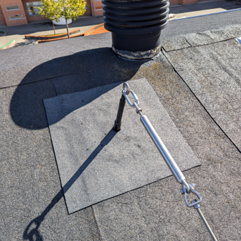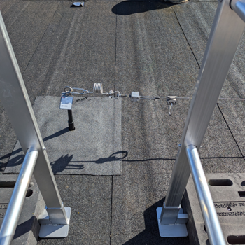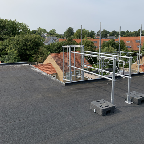 Der er etableret et komplet wiresystem på taget, som giver brugeren en ubrudt sikringslinje fra lejder til arbejdsområde. Ankerpunkterne er monteret med wireposter og glider, så personalet kan passere frit henover punkterne uden at skulle koble sig ud.