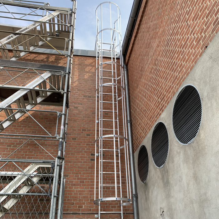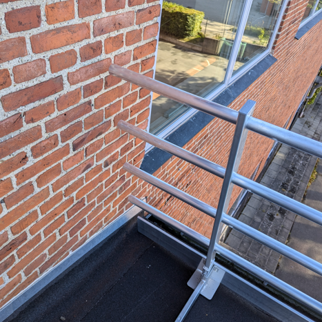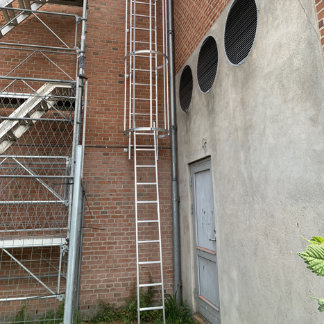 3. Gelænder ved overgang til tag: Et 2 meter langt gelænder er etableret ind på taget, hvilket giver tryghed ved overgangen fra lejder til tag. Dermed er personalet sikret allerede fra det første skridt, når de bevæger sig op på taget.