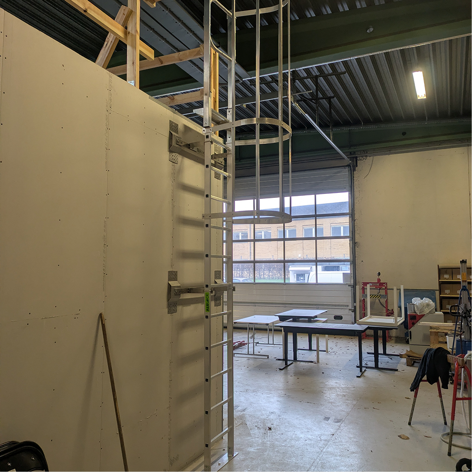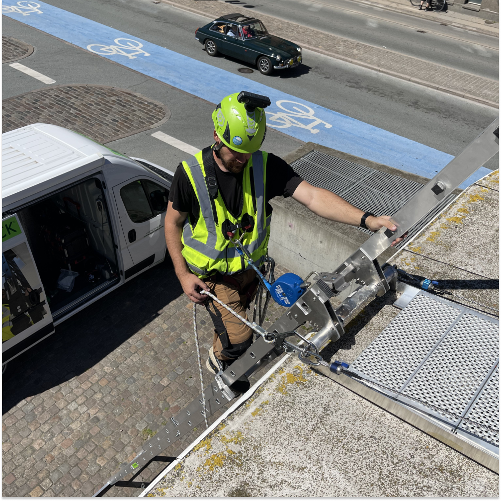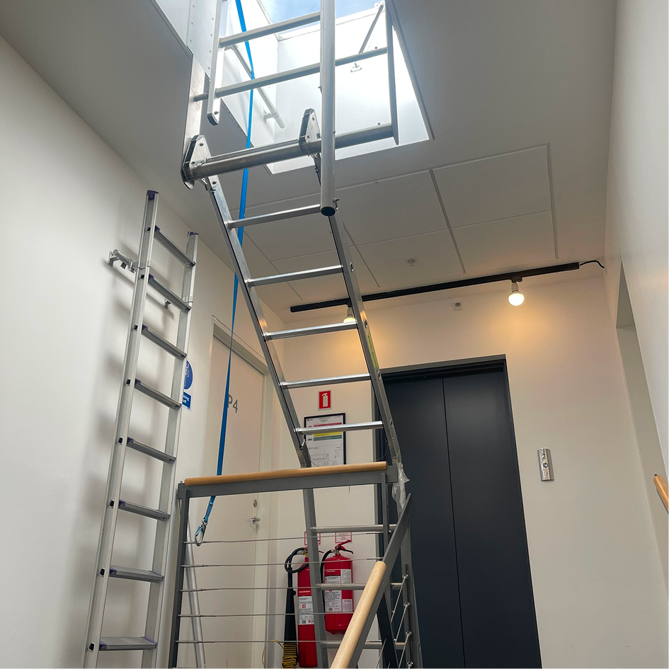 Adgang sker via lejder gennem ovenlys med teleskopisk udstigningsvange, der sikrer en tryg overgang til tagfladen. Rygbøjle er ligeledes tilpasset de faktiske forhold for optimal sikkerhed og funktion.