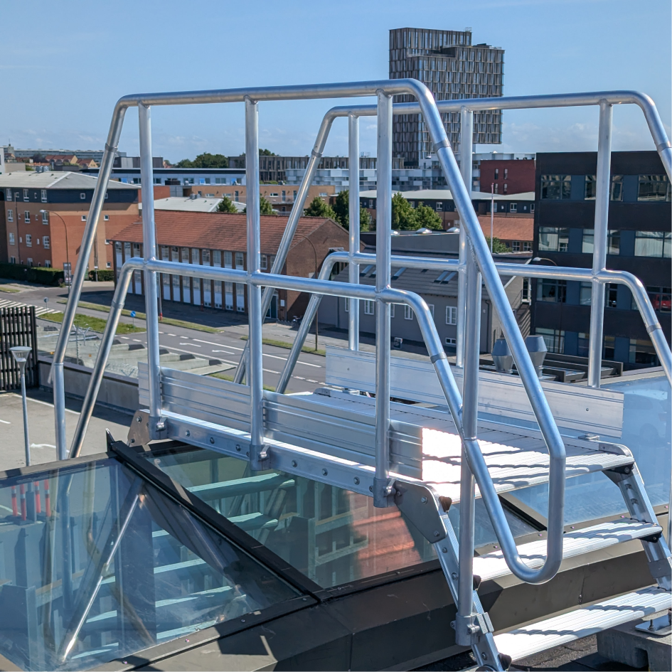 Der er etableret et let og vedligeholdelsesfrit gangbrosystem med tilhørende overgangsbroer placeret i tagets rendesten. Systemet er individuelt tilpasset de eksisterende forhold på site, herunder niveauforskelle og installationer.