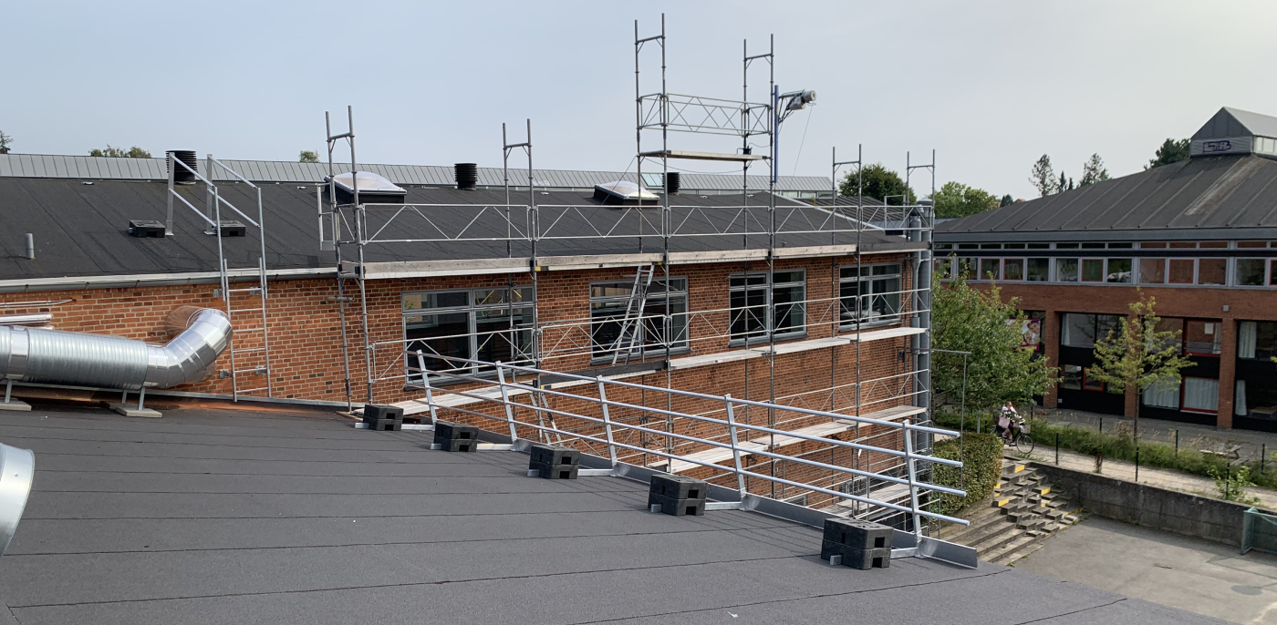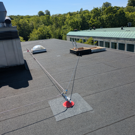 Der er etableret en komplet faldsikringsløsning på det eksisterende tag, som gør det muligt for driftspersonalet at få sikker adgang direkte gennem ovenlyset. Systemet sikrer, at brugeren er tilkoblet faldsikringen fra første kontaktpunkt og hele vejen ud på taget.