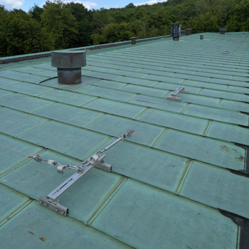 Faldsikringssystemet er eftermonteret i tagets klik-profil uden at ødelægge eller deformere tagkonstruktionen. Samtidig er der sikret tæthed ved alle fastgørelser, så bygningens integritet bevares.