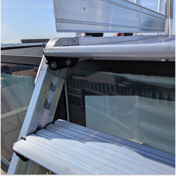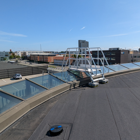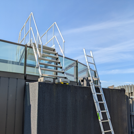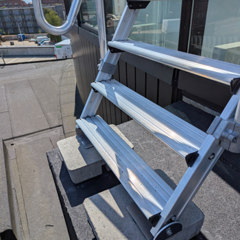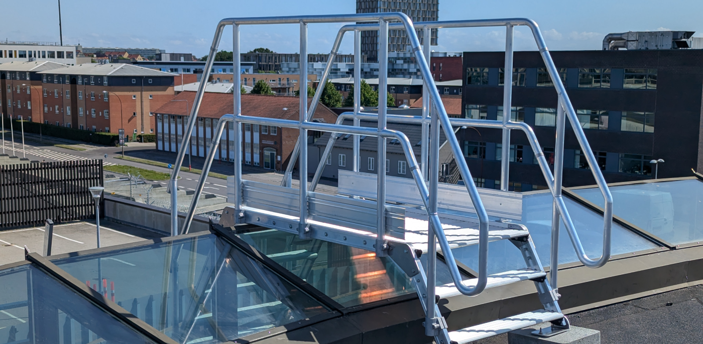 Der er etableret en adgangsløsning bestående af aftagelig lejder og specialtilpasset overgangsbro over glastaget.
