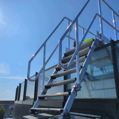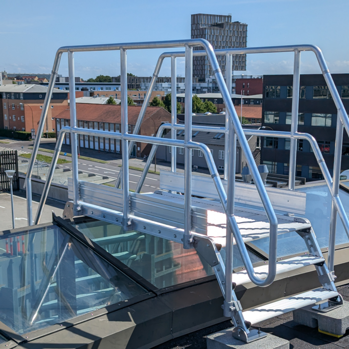 Overgangsbroen er tilpasset de faktiske mål på site og samlet i beslag, der er boltet sammen for stabil og robust konstruktion. Broen står an på taget via ballastvægte og er udført med skridsikker aluminiumsbelægning for sikker færdsel. På modsatte side er der etableret trappe, tilpasset den konkrete højde, så der opnås en sikker og naturlig overgang.