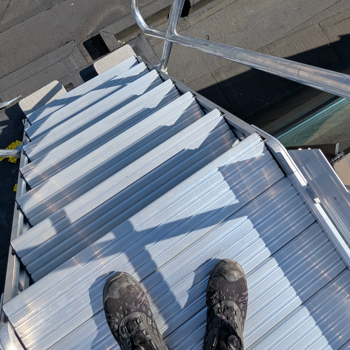 Den gamle gangbro i træ er fjernet og erstattet af lette, vedligeholdelsesfri kompositplatforme, tilpasset tagets hældning og forhindringer.