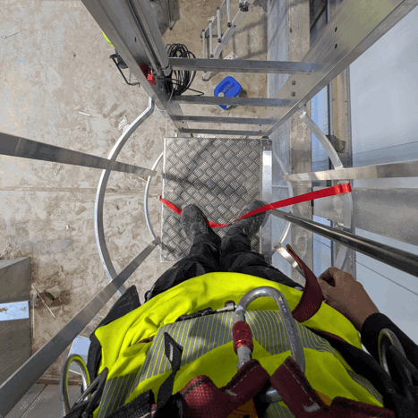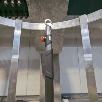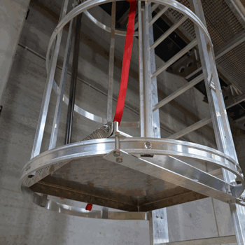 Adgangen er udstyret med teleskopisk udstigningsvange, som kan køres op og ned efter behov. Med en teleskopstang kan brugeren nå faldblokken og tilkoble sig, før næste trin udføres.
