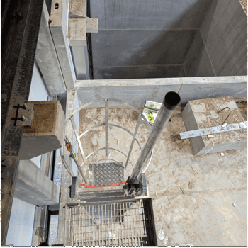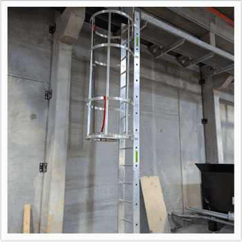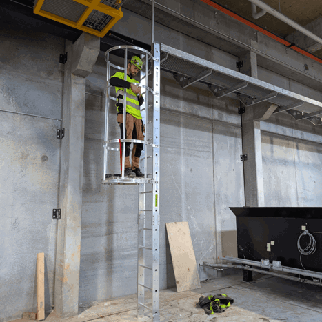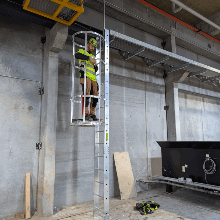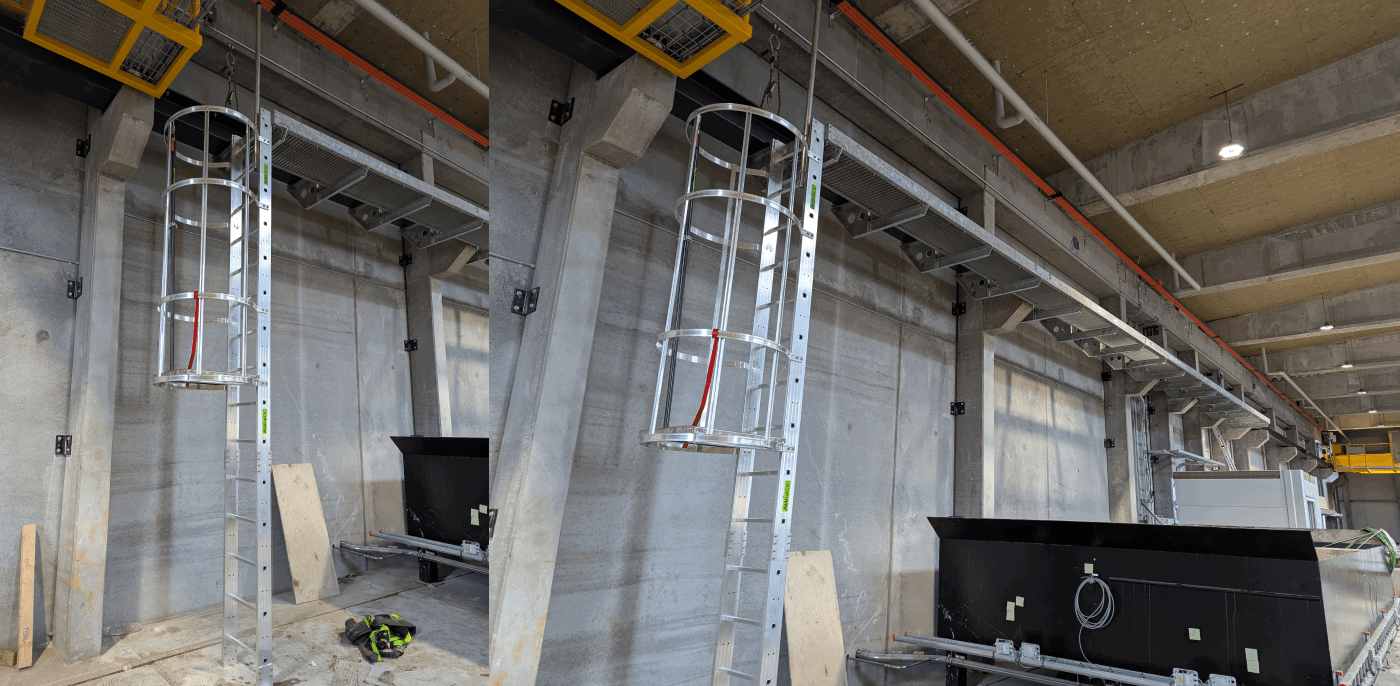 Der er etableret en sikker adgangsløsning til servicerepos med forstærket lejder og foldbar mellemplatform. Brugeren står på mellemplatformen og er sikret i rygbøjle, inden videre opstigning.