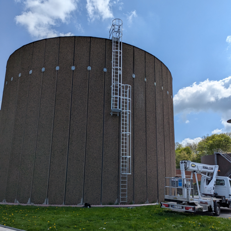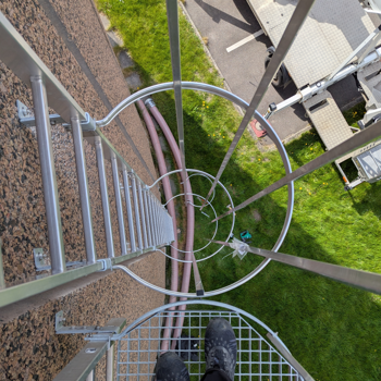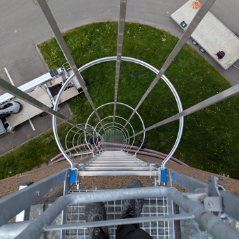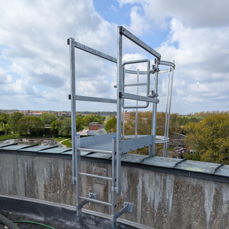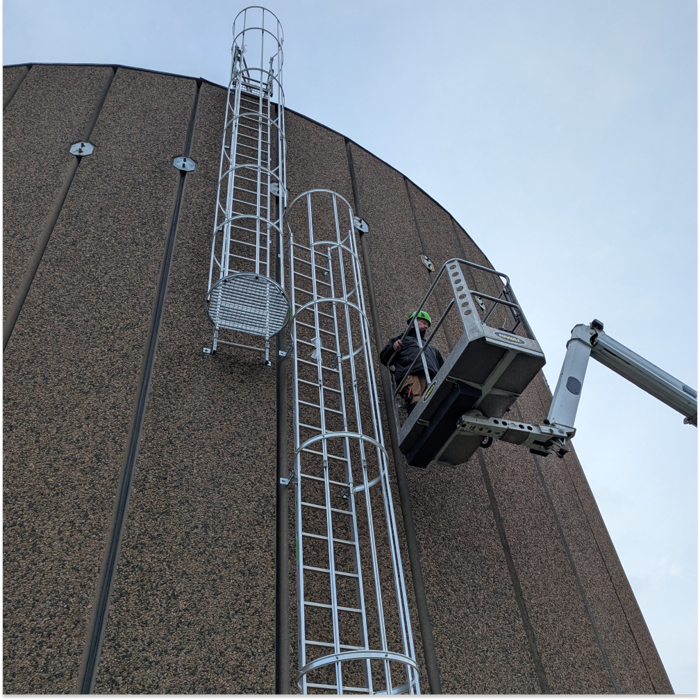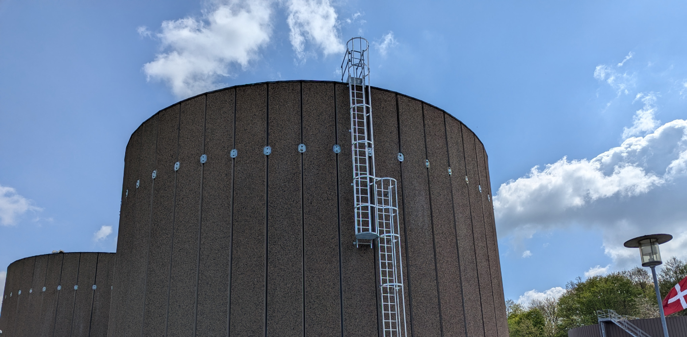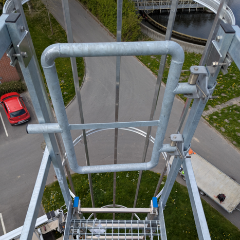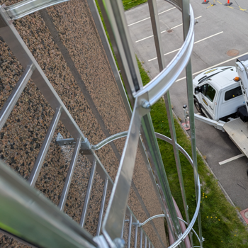 Den nye nødlejderløsning sikrer hurtig og tryg evakuering fra siloens top. Løsningen kombinerer høj sikkerhed, robust konstruktion og nem adgang via overgangsplatform og selvlukkende dør.