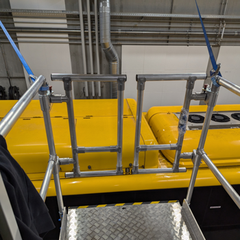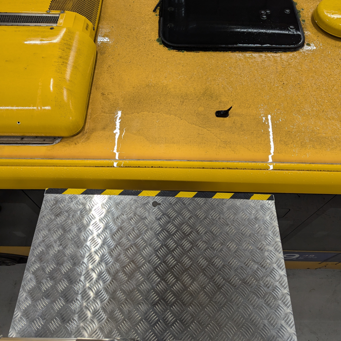 Under arbejdet på bussen kobler driften sig til et faldsikringssystem. Dermed er sikkerheden fuldt integreret i hele adgangen – fra det første skridt på platformen til arbejdet udføres på bussen.