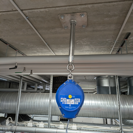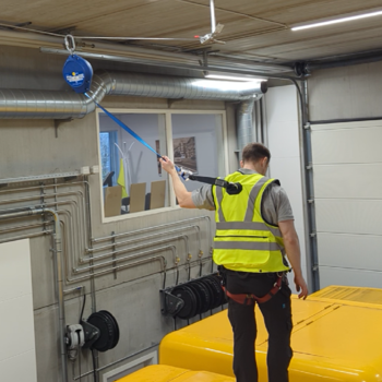 1. Ankerpunkter med faldblok monteret i loftet: Overhead-systemet er opbygget med godkendte ankerpunkter i loftet, hvor 2 faldblokke er monteret. Dette sikrer en konstant tilkobling for driftspersonalet, så de kan arbejde effektivt og sikkert i højden.