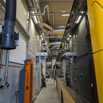 Sikker overhead-løsning til servicering af elbusser: Der er etableret 14 meter overhead faldsikring, som muliggør, at to driftsfolk samtidig kan bevæge sig sikkert rundt på bussen under servicearbejdet. Løsningen er udviklet specifikt til de nye elbusser hos Keolis og kombinerer sikkerhed og fleksibel adgang.